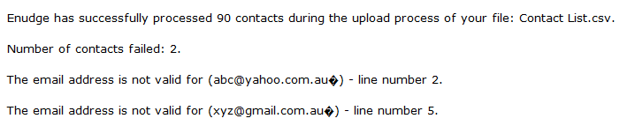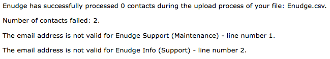 When uploading contacts (using .CSV or .TXT files), errors may occur causing some of your contacts not to be added into your Enudge account. Enudge will send you an email report, listing down the contacts which failed to be added, along with the reason for the failure.