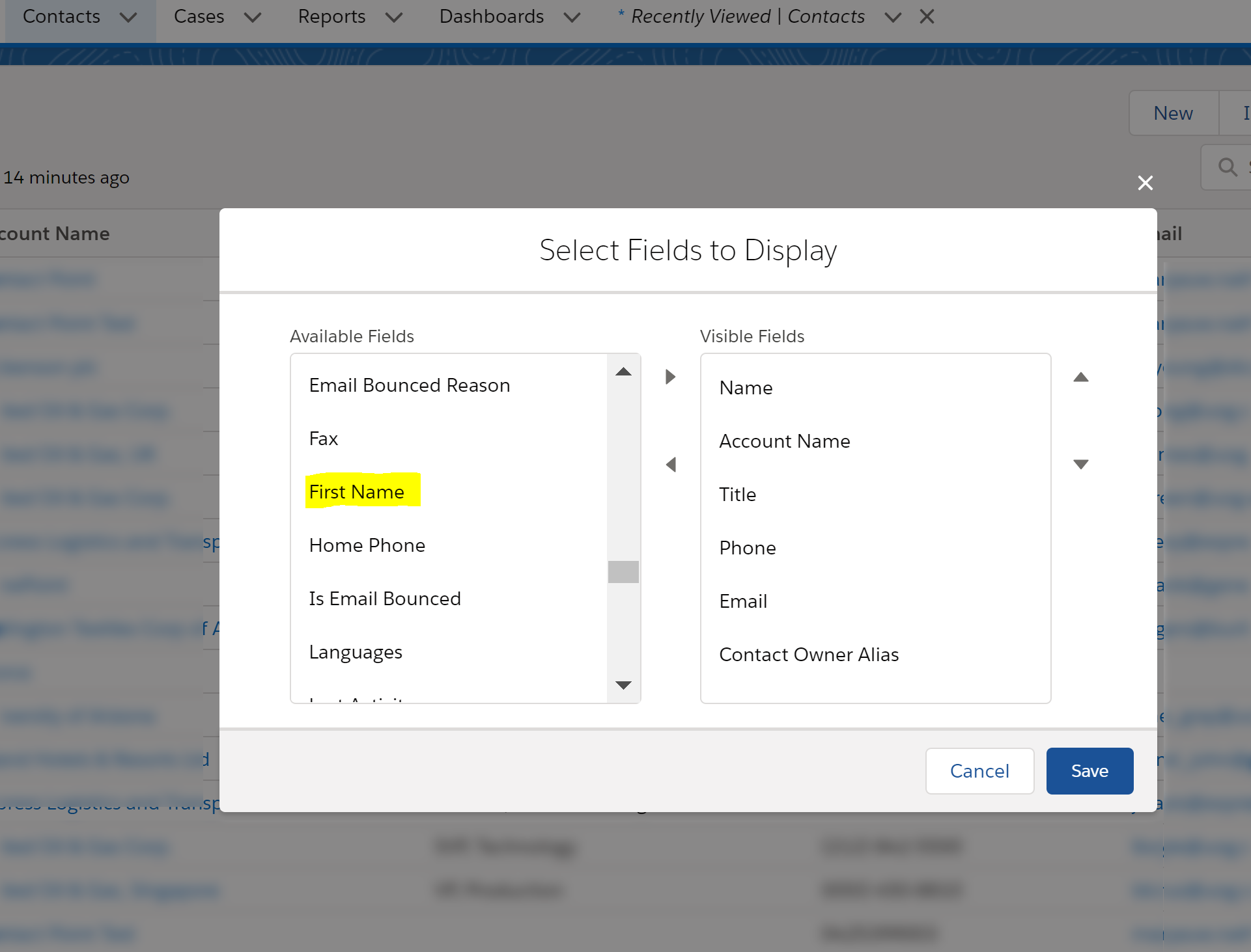 When using the List View, by default Salesforce will provide the “Name” field as a combination of first name and surname. Enudge will attempt to split the contents of the Name field into the Enudge ‘firstname’ and ‘surname’ fields. However, for better results, we recommend that you modify your List View to include the individual first name and surname fields instead. You can do this in Salesforce as follows: