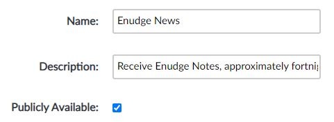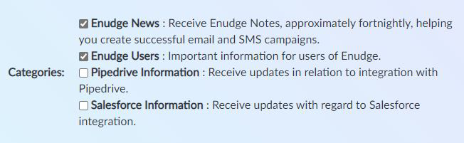 Only categories marked as ‘publicly available’ will appear in the form used by your contacts to update their preferences. Both the name and description of all publicly available categories are shown. Below is an example of how the screen looks for Enudge subscribers (we have 4 public categories):