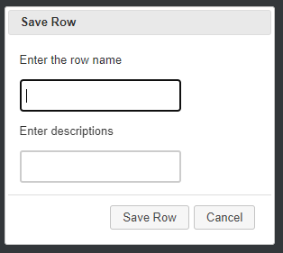 Click on the left-most ‘Save’ icon to see a popup where you can enter the name of your row, and a description. Then click the ‘Save Row’ button.