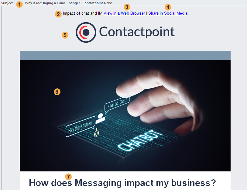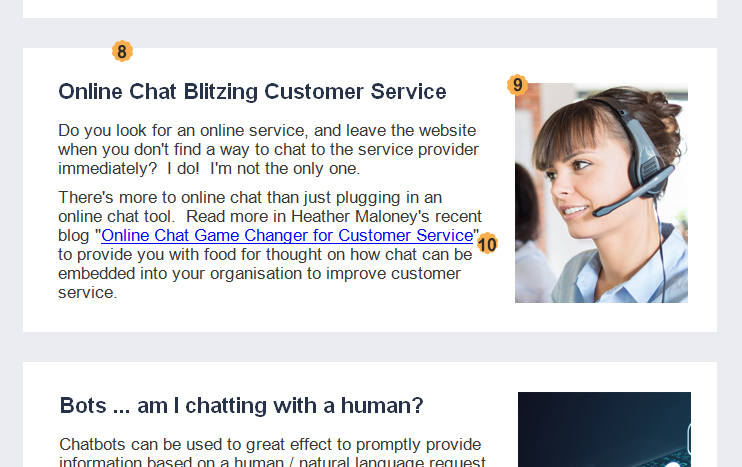 8. Each point within the newsletter is separated clearly, given a heading which creates interest as well as introducing the topic, and a hyperlink. Even though this email campaign is a newsletter, we are not tempted to include lots of long sections of information within the email. Instead, each specific topic within the themed newsletter is expanded in a blog post on the Contactpoint website. A summary / teaser is included in the email, with a hyperlink to read the actual blog post. A click on a particular topic allows us to track interest in that specific topic by that person.