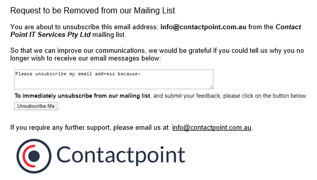 When a recipient clicks on the unsubscribe link, they are presented with a web form, confirming the email address that will be unsubscribed, alongside your account name and your logo. Your contact then needs to click on the Unsubscribe button to complete the process. If they fill in the form to tell you why they have unsubscribed, you will receive an email including their reason. Below is an example of what the web form looks like for the Contactpoint Enudge account (your logo and company name etc will appear instead of the Contactpoint details of course).