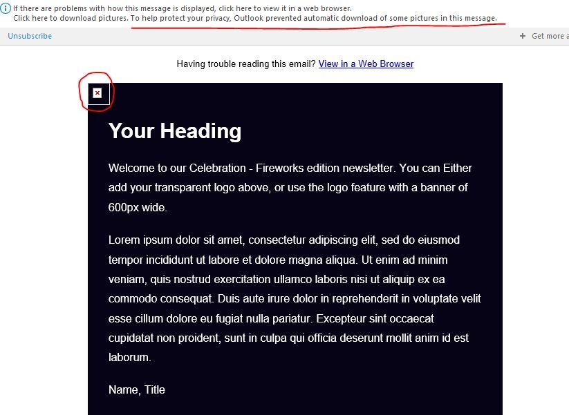 Microsoft Outlook for example is configured by default to block automatic picture downloads in emails. Below is an example of an email with a hero image in the header, when read using Outlook for desktop.